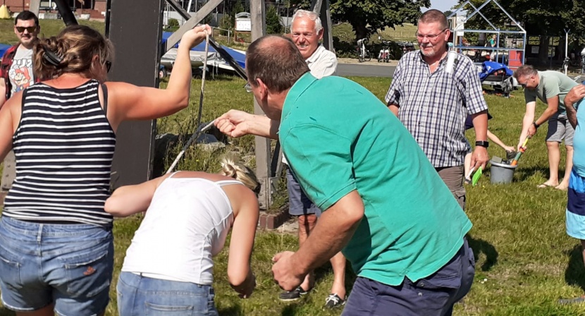 So konnten wir im Schatten Kräfte für die vier Wettkämpfe sammeln. Team Rot gegen Team Grün startete als erstes mit dem Wikingerspiel. Bei dem Spiel galt es, in einem abgesteckten Spielfeld möglichst viele Holzstücke im generischen Feld umzuwerfen. Nach anfänglichen Startschwierigkeiten holzte Team Rot alles weg und gewann die erste Runde. Mit einem Schwamm möglichst viel Wasser von A nach B zu befördern, mit kleinen Bechern das Wasser dem Hintermann über den Kopf in Becher zu schütten und Zöpfe im großen Stil zu flechten, das waren die Herausforderungen, die Jung und Alt zusammen meisterten. Am Ende hatten wir ein Unentschieden und es musste schnell ein 5. Spiel erfunden werden. Wir einigten uns auf Becherschießen mit einer Wasserspritze. Klar, entschlossen und mit einer hohen Zielgenauigkeit holte unser kleiner Henry für Team Rot den Sieg und schoss alle Becher mit beachtlicher Willensstärke von der Bank.