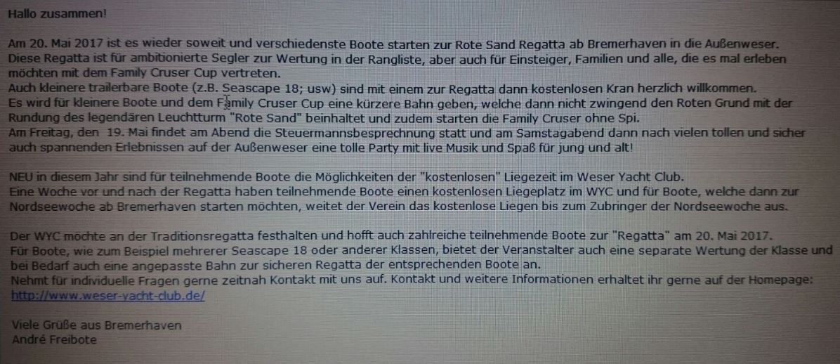 No Title « Alle Veranstaltungen Diese Veranstaltung hat bereits stattgefunden. Rotesand Regatta 2017 20. Mai 2017 « Weserglocke Regatta Rund um Fisch und Fleisch » + Google Kalender+ iCal exportieren Details Datum: 20. Mai 2017 Veranstaltungskategorie: Regatta Veranstaltungsort WYC Bremerhaven Bremerhaven, Google Karte anzeigen
